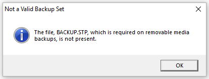 - "The file, BACKUP.STP, which is required on removable media backups, is not present."