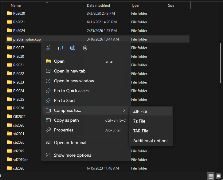 - A ZIP file will be created (in this case, "pr26tempbackup.ZIP").