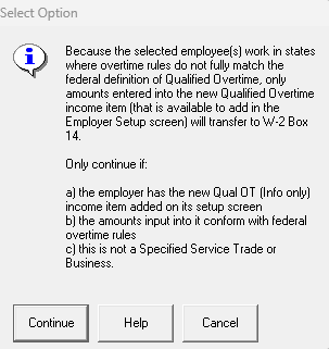 Payroll System 2025 can transfer overtime amounts to Box 14 of the W-2. If you encounter this popup message, you will need to utilize the new Qualified Overtime income item.