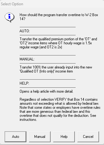Payroll System 2025 can transfer overtime amounts to Box 14 of the W-2. If you encounter this popup message, you must instruct the program to attempt to automatically calculate the amount or to use the amounts you input into the new Qualified Overtime (Info Only) income item.