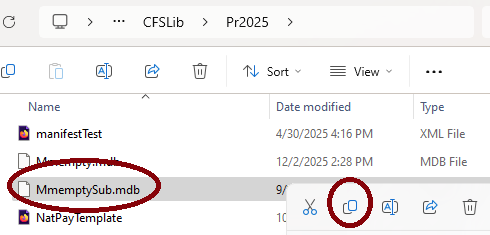 - Locate the MmemptySub.mdb file, right-click on it, then left-click on "Copy" or the copy icon: