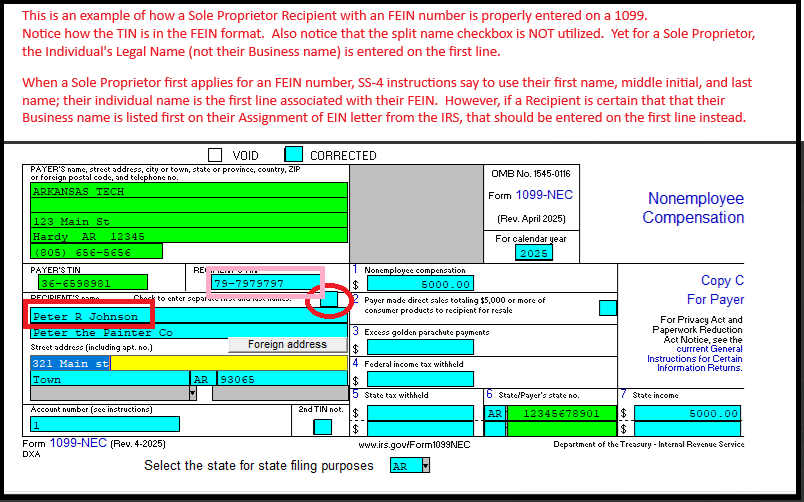 IF THE RECIPIENT IS A SOLE PROPRIETOR, their Legal Name as an Individual usually needs to be listed first on the 1099, even if a FEIN is used instead of a Social Security number. Their DBA can then be entered on the 2nd Name line, as follows: