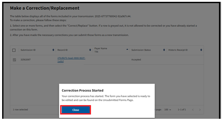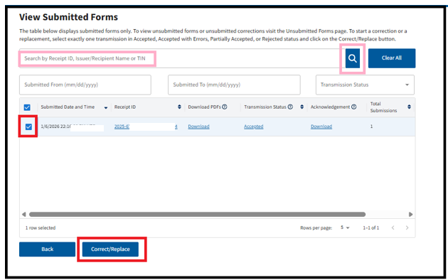 Record ID Link: Once the IRS accepts a form with correction, the historic receipt ID will populate and link the form to its original transmission.