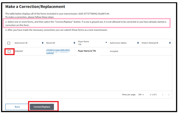 - Mark the check box next to the transmission in need of correction. After making the selection(s), click the Correct/Replace button. Next check-mark the individual Record ID's that need correction, and again click the Correct/Replace button.