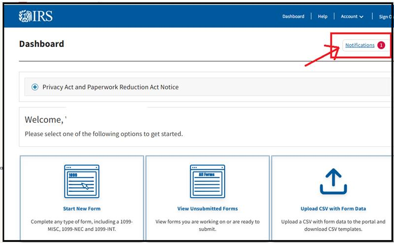 From the View Submitted Forms page you can also choose the Download link (under "Download PDFs" column) to download your Corrected 1099 (to distribute to the Recipient). Note that it will initially go to your "Notifications" within IRIS (found in upper right-hand corner of the Dashboard). From there you can download to your computer.