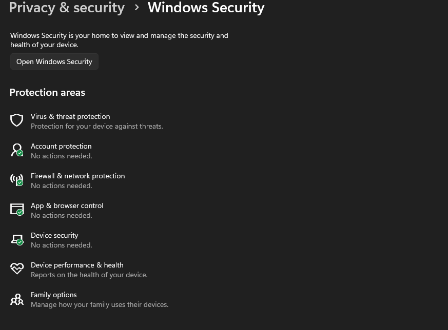 - Navigate to Windows Settings > Privacy & Security > Windows Security.