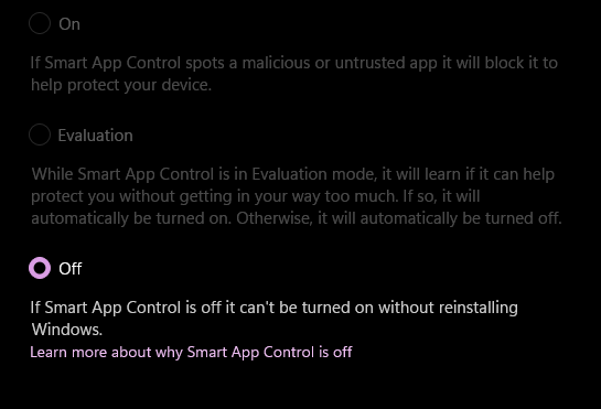 Windows Smart App Control has been known to cause this error, it can be edited or disabled in Windows Security Settings.