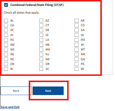 - Scroll down to Combined Federal/State Filing (CF/SF) and mark the checkbox.