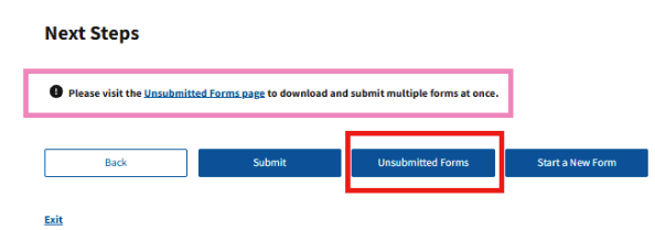 - On the last screen, scroll down until you see the last choices as illustrated below. Although you may choose to “Submit” this form independently, most users will choose to go back to the Unsubmittted Forms page (to continue selecting more forms to mark for state efiling), repeating Steps 2-7 of this Help Article for each form. Choose Unsubmitted Forms: