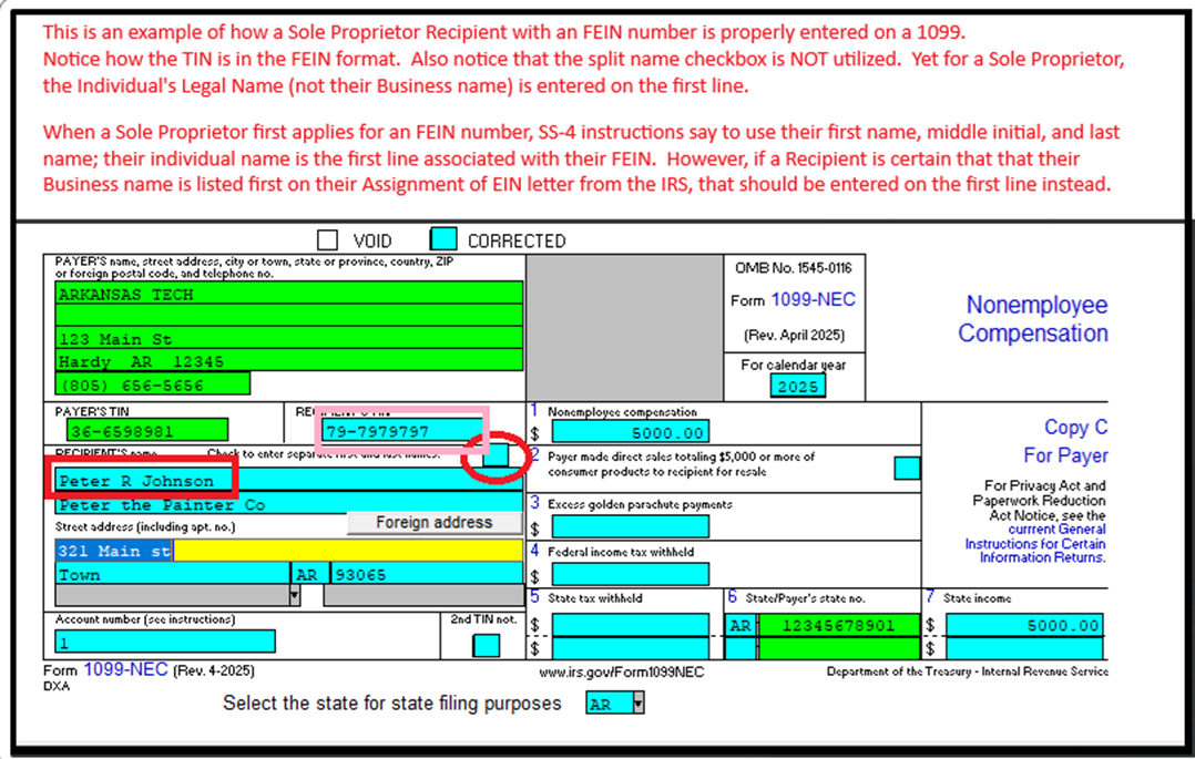 If the Recipient has furnished a FEIN number, it is common to think a business name should be listed on the first name line. However, this is generally not true in the case of a Sole Proprietorship.