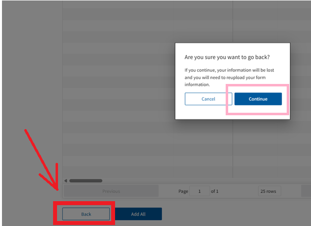 Click “Back” and then “Continue” to remove ALL the information you just attempted to upload.