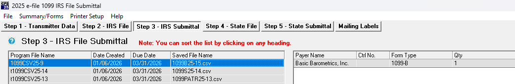- Select the rejected file so that it is highlighted in blue. Note that you can confirm the contents as it will show the Payers names, Form Type and Quantity of Forms on the right hand side of the screen