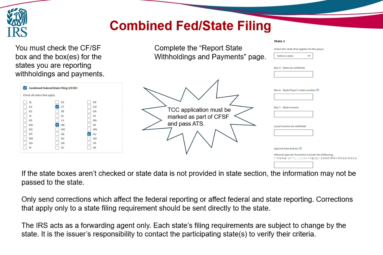 We are planning to support IRIS combined state filing starting in tax year 2026. To participate in Combined Federal/State Filing in IRIS, mark the Combined Federal/State Filing option on your IRIS application and in the appropriate checkboxes when filing the return.