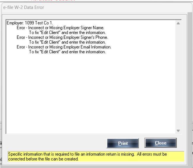 - W-2 E-Filing: Specific information that is required to file an information return is missing. All errors must be corrected before the file can be created.