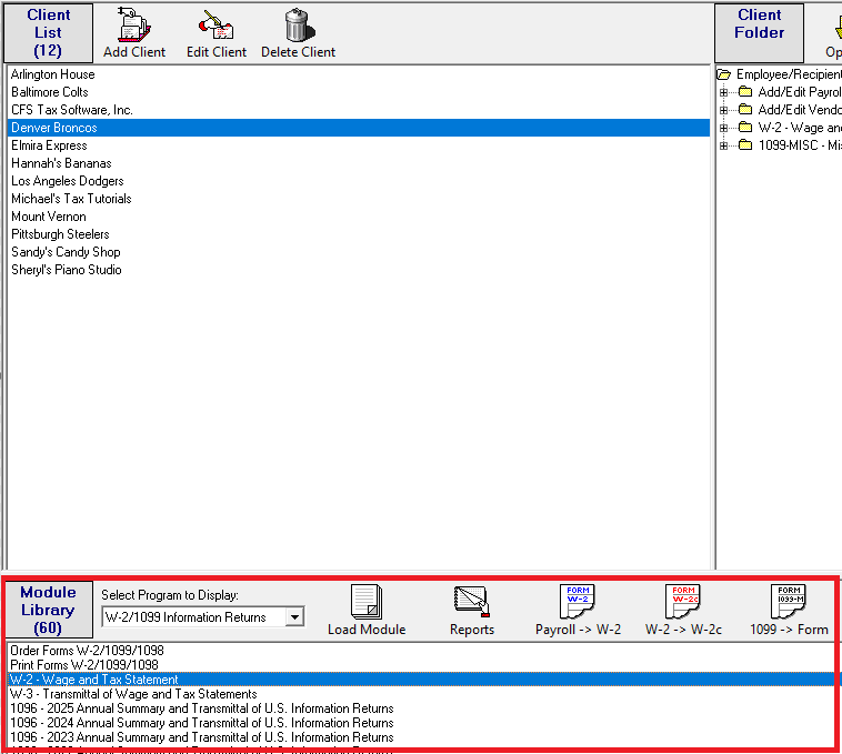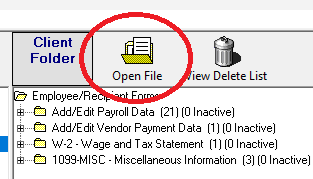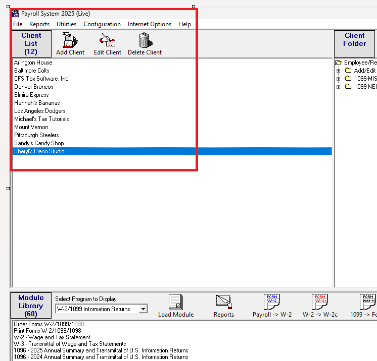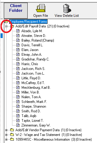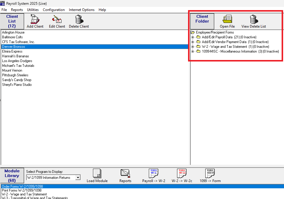 The right half of the screen displays the current Client Folder. The Client Folder is a list of employees/payees and form or worksheet modules that have one or more data files saved for the current client.