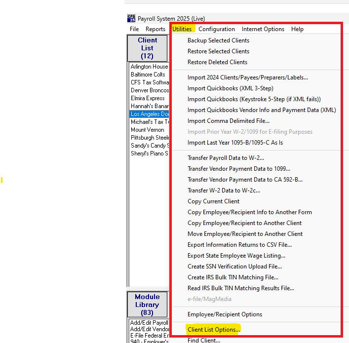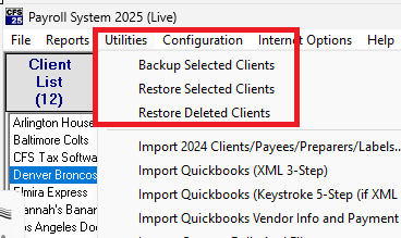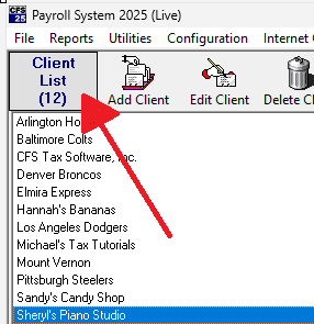 A list of clients, also referred to as employers or payers, in the current database is displayed on the top-left half of the screen.