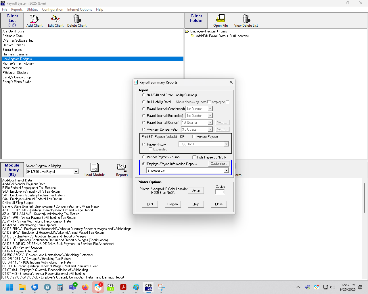 A list of clients may be printed by clicking the Reports button and selecting Employer List from the Employer/Payee Information Reports dropdown list.
