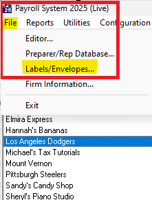 - Client mailing labels may be printed by selecting Labels from the File menu which will load the Label/Envelope Maker module.
